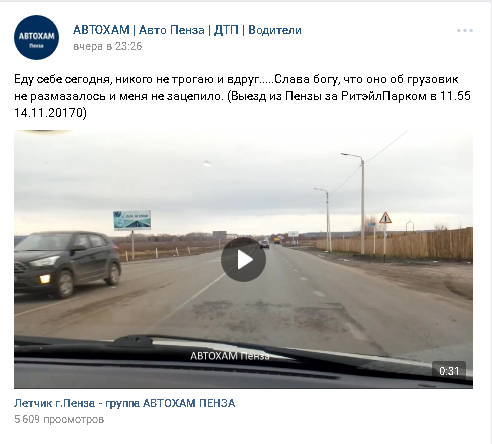 Еду себе сегодня, никого не трогаю и вдруг.....Слава богу, что оно об грузовик не размазалось и меня не зацепило. (Выезд из Пензы за РитэйлПарком в 11.55 14.11.20170)