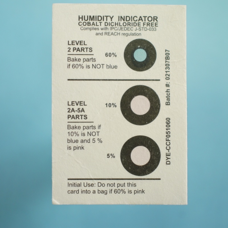 Индикаторы влажности бумажные (Humidity Indicator Cards, HIC) применяются для определения случаев превышения допустимого уровня влажности внутри упаковки с электронными компонентами. При получении электронных компонентов потребитель может наглядно убедиться в том, что условия хранения и транспортировки поставщиком не нарушались. Индикатор влажности представляет собой бумажную карточку с нанесенным химическим реагентом, изменяющим свой цвет под воздействием влаги. Как правило, на карточке располагаются несколько кружков, которые изменяют цвет с синего на розовый – каждый при своем уровне относительной влажности окружающей среды. Даже если в дальнейшем уровень влажности снизится, цвет кружка останется неизменным.