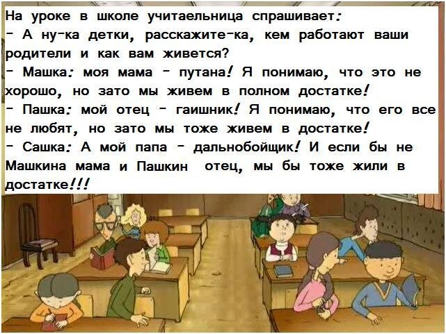 Все мы знаем, что маленькие детки весьма часто выдают забавные заметки, которые они подчеркивают из жизни своей семьи и не только. Помню, как моя учительница младших классов, вела отдельную тетрадку, куда она записывала наши "гениальные" наблюдения, когда нам было по 7-8 лет. Думаю этот анекдот тоже из воспоминаний такой же учительницы младших классов: Если вам понравилась публикация, поднимите, пожалуйста, палец вверх. Нам будет очень приятно. Кликните на наш логотип, чтобы увидеть остальные наши анекдоты... От имени нашей редакции - веселого дня и вечера тебе, дорогой читатель!