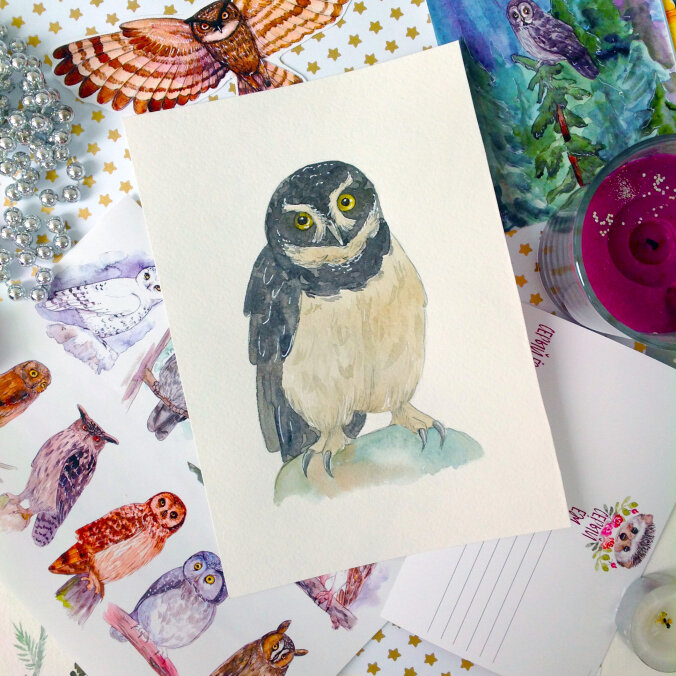 Сегодня мы нарисуем очковую сову – довольно крупную птицу, которая обитает в тропиках, в частности, в Панаме. Я всегда работаю акварелью, поэтому этот и остальные уроки будут выполнены именно в этой технике, но основные принципы можно применить и для других материалов. Поехали? Нам понадобится: Клюв начинаем рисовать чуть ниже центра головы. Глаза у очковой совы крупные, круглые. Расстояние между глазами примерно равно ширине одного глаза. Сверяясь с фотографией, дорисуем детали: «очки» вокруг глаз, «воротник», очертания крыльев и хвоста, лапки с коготками, зрачки. Еще раз сверим пропорции. Сейчас не поздно что-либо поменять, если заметили ошибку. Если все в порядке и вам нравится ваша сова, стираем ластиком лишние линии. Я беру примерно в равных пропорциях краску трех цветов: индиго, фиолетовый и марс коричневый. Смешиваю их на пластиковой палитре. Если хотите сделать оттенок более теплым, возьмите побольше марса. Холодным – добавьте индиго. У меня получилось так: Теперь получившим