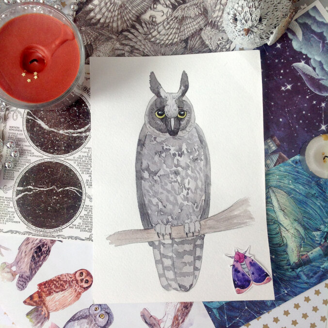 Привет, друзья! Сегодня мы с вами дошли ровно до середины второго этапа совиного марафона, с чем я вас поздравляю! Давайте-ка нарисуем стигийскую ушастую сову – чуднУю, очень необычную птицу из Центральной Америки, похожую, скорее, на какое-то древесное животное. Искать её фотографии лучше по ее латинскому названию – Asio stygius, потому как по русскому эквиваленту как-то не очень много референсов. Ну что, начнем? Рисовать ее совсем не сложно и увлекательно, можете попробовать творить всей семьей. Нам понадобится все то же, что и для предыдущих уроков, а именно: акварельная бумага, карандаш с ластиком, акварельная краска, стакан воды, кисти, черная и белая ручки (по желанию). Начнем с того, что возьмем лист и наметим контуры совы. У нее круглая небольшая голова, вытянутое тело и крупные перьевые ушки. Прорисуем «лицо». У этой совы печальные глаза, будто прикрытые сонными веками, а еще очень отчетливая группа перьев у клюва, словно мордочка у зверька. Стигийская ушастая сова имеет ок
