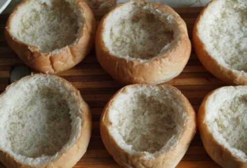 Начинать готовку такого закусочного блюда следует с булочек, которые нужно разложить на стол, с каждой из них срезать крышечки, после этого аккуратно нужно вынуть мякиш. Если не удалось приобрести небольшие булочки, то можно взять крупные, но в этом случае их понадобится в два раза меньше по количеству.