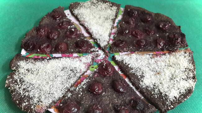 Пицца, да еще и шоколадная, да еще и не портит фигуру-ну разве не сказка?! ;) Получается очень вкусной, а варианты с начинками ограничиваются только полетом вашей фантазии. Ингредиенты тесто творог - 150 гр. кокосовое масло - 1 ст. ложка какао - 2 ст. ложки овсяные отруби - 4 ст. ложки стевия начинка вишня - 14 ягод кокосовая стружка Шаги 1. В большую миску выкладываем творог, овсяные отруби (если у вас крупные отруби, то можно предварительно смолоть их в муку), какао, кокосовое масло, 1 пакетик сахарозаменителя. 2. Все ингредиенты хорошо перемешиваем ложкой до однородной массы (как бы перетирая их ложкой, чтобы они хорошо смешались!). 3. Выстилаем противень пекарской бумагой. Берем наше тесто (оно должно получиться плотным), выкладываем в центр противня и руками распределяем его тонким слоем так, чтобы получился круг. 4. Мысленно делим нашу пиццу на 6 частей. 3 части обильно посыпаем кокосовой стружкой. Для того чтобы линии, отделяющие части были более четкими - возь