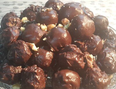 Готовим действительно низкокалорийные диетические конфеты! Сейчас очень модно готовить домашние ПП конфеты из орехов и сухофруктов. Будьте внимательны — эти конфеты хоть и полезны, но совсем не низкокалорийны и лучше подойут для детей как замена магазинных сладостей. А для тех, кто следит за фигурой и, тем более, худеет такие конфетки опасны:) Ингредиенты для начинки творог - 150 гр. молоко - 100 мл. овсяные отруби - 100 гр. чернослив - 150 гр. грецкий орех - 30 гр. стевия для глазури молоко - 250 мл какао - 2 ст. ложки агар-агар - 2 ч. ложки желток - 2 шт. стевия Шаги Готовим начинку 1. В миску выкладываем 3 столовых ложки творога, 100 граммов овсяных отрубей, стевию (2 пакетика), 100 мл молока. 30 граммов орехов измельчаем, 150 граммов чернослива режем на мелкие кусочки и тоже добавляем в миску. Все очень хорошо перемешиваем, чтобы получилось однородное тесто. 2. Катаем шарики. Руки нужно смочить водой, чтобы тесто не прилипало. Размер шариков - как конфетки Рафаэлло