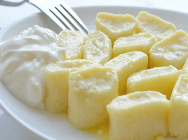 Не все люди любят творог, но весьма трудно переоценить его пользу для организма. Сегодня мы предлагаем замечательное, здоровое, быстрое блюдо, которое идеально подойдет к завтраку. Ленивые вареники понравятся и взрослым и малышам. Ингредиенты 2 пачки творога (380 гр.) 2 яйца 3-4 столовых ложки муки Соль Сливочное масло Сметана Приготовление Разминаем творог вилкой, добавляем соль или сахар, ориентируемся по предпочтению, перемешиваем, по немного добавляем муку, замешиваем тесто. Стол обсыплем мукой, выложим тесто, раскатаем колбаску и нарежем ленивые вареники. Возможно, муки понадобится чуть больше или меньше, все зависит от влажности творога. Тесто не должно быть сильно крутым, но и к рукам оно не должно прилипать. Опускаем вареники в подсоленную кипящую воду и варим пару минут после всплытия. Вынимаем шумовкой, добавляем сливочное масло и сметану. Подаем к столу. Приятного аппетита!
