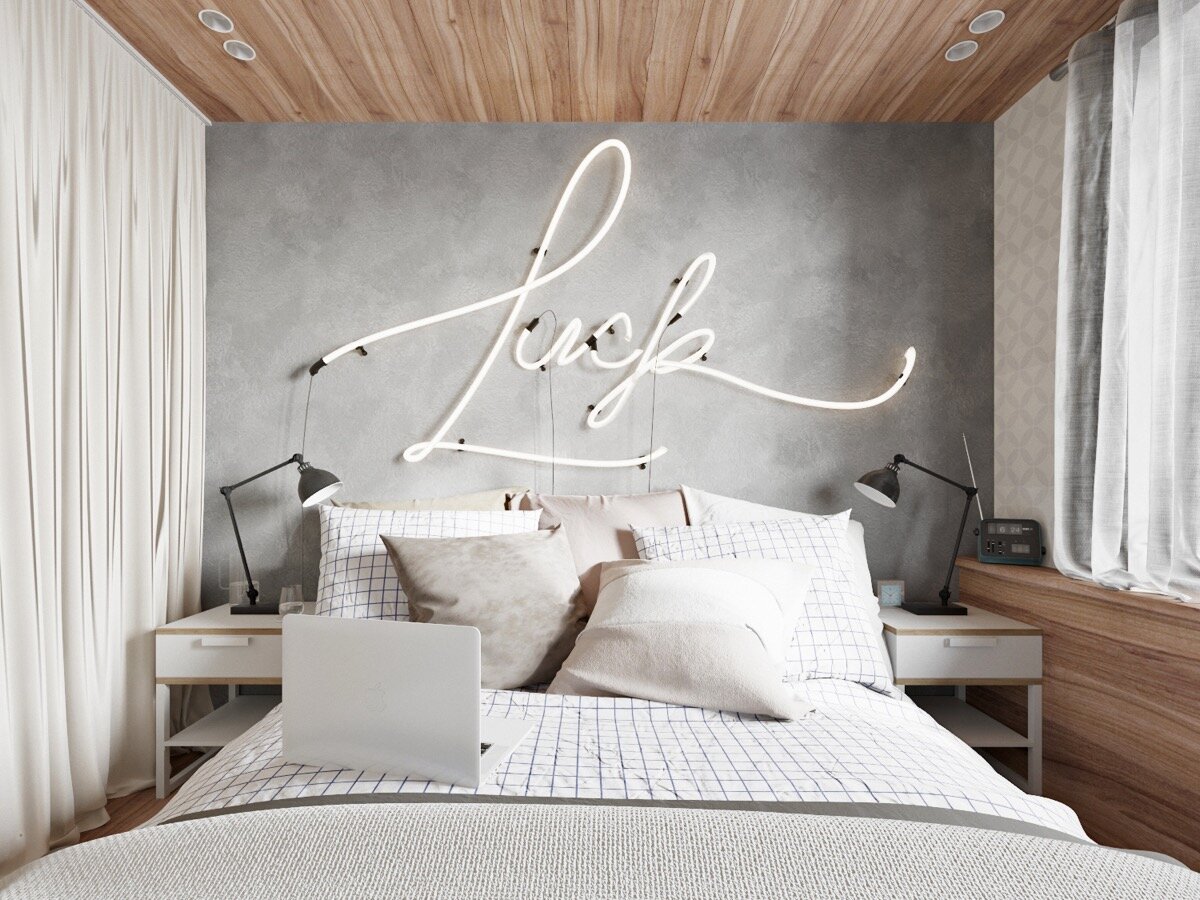 Изголовье может стать полноценным декоративным элементом и главным акцентом в спальне. И подойдут для него самые неожиданные отделочные материалы. 1. Оставьте всё как есть Да-да, порой бетонная или кирпичная стена сама по себе настолько красива, что использовать какую-то отделку просто рука не поднимается. Можно лишь немного расставить акценты при помощи люминесцентной надписи, настенного декора, картины или постера. И не забудьте про подушки – рядом с грубой стеной их должно быть много! 2. Поклейте обои Обои не устаревают, и они по-прежнему незаменимы для бюджетной отделки стены за кроватью. Если предпочитаете крупноформатные дизайнерские варианты, то советую не покрывать ими всю стену, а сделать обрамление. Например, установить стеллажи по обе стороны от кровати. Яркости интерьеру придадут и совсем простые модели обоев, например, в крупных чёрных точках. 3. Увеличьте мягкое изголовье Если обходиться без мягкого изголовья вы не намерены, просто «растяните» его во всю стену.