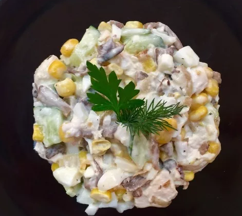 Салат сытный и вкусный, ингредиенты доступны и просты, готовится очень быстро. Попробуйте приготовить к семейному ужину, вам понравится! Ингредиенты 400 гр. шампиньонов 1 куриная грудка 1 луковица 2 огурца (свежих) 300 гр. консервированной кукурузы Соль и черный молотый перец по вкусу Растительное масло майонез Приготовление Грибы помоем, нарежем пластинками, кладем на сухую сковороду и слив выделившийся сок обжарим на растительном масле, добавив растительное масло и мелко нарезанный лук. В миску нарезаем огурцы, высыпаем кукурузу, добавляем нарезанное мелкими кусочками отварное филе курицы, жареные шампиньоны, кладем майонез, соль,черный молотый перец и перемешиваем. Даем салату пару часов остыть и подаем к столу. Приятного аппетита!