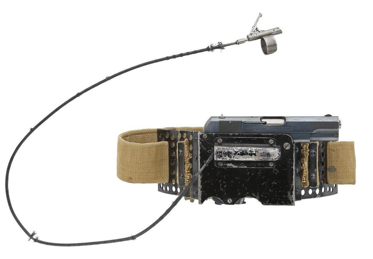 Этот занятный стрелковый аксессуар изготовлен в США в 1941 году, но хранится в британском королевском арсенале. Широкий пояс и выведенный на длинном проводе спусковой крючок, который надевался на палец. Судя по небольшой длине провода, пистолет крепился подобно оперативной кобуре – под мышкой. Стреляющий пояс изготовлен по чертежам Годфрея Де Лизла, работавшего в британском Министерстве авиации – создателя известного бесшумного карабина. Первый его вариант выдавался агентам британской разведки и нёс 6,35-мм пистолет «Веблей-Скотт» с укороченным стволом, превращённый из самозарядного в однозарядный. Следом за ним был разработан вариант для американской разведки, под Colt Model 1903 популярный у спецслужб США.