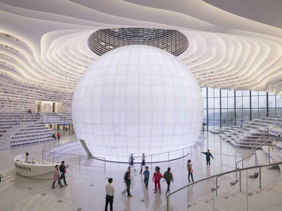 Голландская архитектурная фирма MVRDV в сотрудничестве с местными архитекторами TUPDI завершила строительство библиотеки Тяньцзинь Биньхай, необыкновенного пространства для города Тяньцзинь, Китай. В самом сердце этого уникального здания, построенного всего за три года, сферический зал под названием "Глаз" задает тон и приглашает вас открыть широкие глаза. В этой великолепной инфраструктурой увековечена фотографом Осип Ван Duivenbode, миллионы книг занимают бесконечные книжные шкафы вокруг светящегося шара, с колоссальными полками, поднимающихся до самого потолка. Достаточно, чтобы сделать любителей литературы головокружение. Этот культурный центр площадью 33 700 м2 располагает светящимся сферическим зрительным залом с каскадом книжных шкафов от пола до потолка. Книжная полка является основным пространственным устройством здания и используется как для обрамления пространства, так и для создания лестницы, сидения, многослойного потолка и даже жалюзи на фасаде. Библиотека также содержит