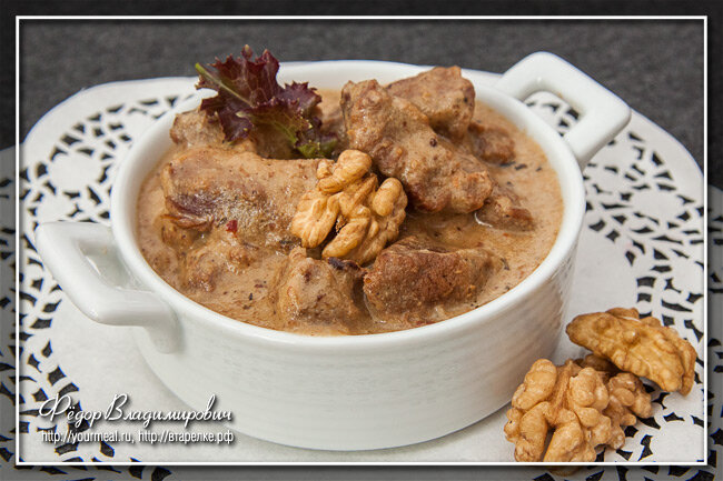 Мясо в ореховом соусе — грузинское блюдо, со всеми атрибутами грузинской кухни — пряное, ароматное, сытное и очень вкусное. С первого взгляда может показаться, что блюдо весьма похоже на сациви, или на мясо в соусе баже, но это не так. В первую очередь здесь нет отдельного приготовления мяса и соуса — все готовится вместе, что не в пример удобнее и проще. Для мяса в ореховом соусе понадобится Готовим мясо в ореховом соусе Мясо для этого блюда можно взять совершенно любое. Подойдет и баранина, и свинина, и говядина, и мясо птицы. А поскольку тушить мясо нужно достаточно долго, то можно взять и недорогие отрубы, которые как раз и хороши для тушения. Но все же лучше всего в этом блюде выступает говядина. Мясо нарезаем небольшими кусками. Хорошо разогреваем в большой глубокой сковороде с крышкой немного растительного масла и выкладываем нарезанное мясо. Помешивая обжариваем до изменения цвета. Репчатый лук нарезаем небольшими кусочками. Отправляем репчатый лук к мясу, добавляем соль, ч