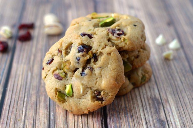 Добавить муку. Соединить с фисташками и клюквой. Замесить тесто. - Разделить тесто на две части. Скатать две «колбаски». Обернуть в пищевую пленку. Охладить в течение 1 часа.