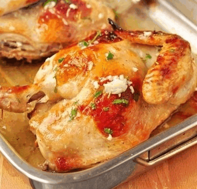 В чашечку выдавить через пресс чеснок, добавить к нему масло, лимонный сок, воду, соль, перец, нарезанную петрушку, перемешать и оставить настаиваться. - Курицу вынуть из духовки и щедро смазать чесночным соусом.