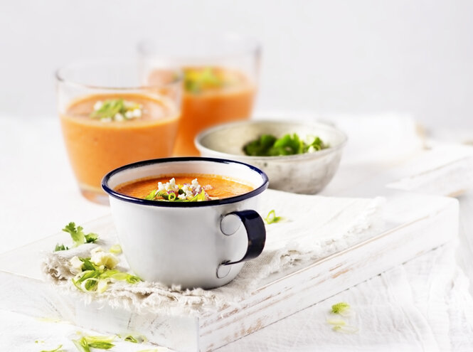 Суп готовится из свежих овощей. Ингредиенты: Томаты жёлтые 500 грамм Перец болгарский жёлтый 1 шт. Тыква 1 шт. (маленькая) Лук-шалот 2 стручка Сок морковный 0,5 стакана Хересный винный уксус 2 столовых ложки Соль по вкусу Мята свежая Сметана Приготовление: В блендер отправить томаты, болгарский перец, тыкву, лук-шалот, морковный сок, уксус, соль смешать и довести до однородного состояния. Затем перелить в ёмкость и отправить в холодильник на 2 часа. Тем временим измельчить листья мяты и смешать со сметаной. Суп подавать с ложкой мятной сметаны. Приятного аппетита.