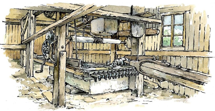 И по принципу своего действия эта машина походила на древнейшую пильную мельницу обнаруженную в Керазе (на рисунке реконструкция)