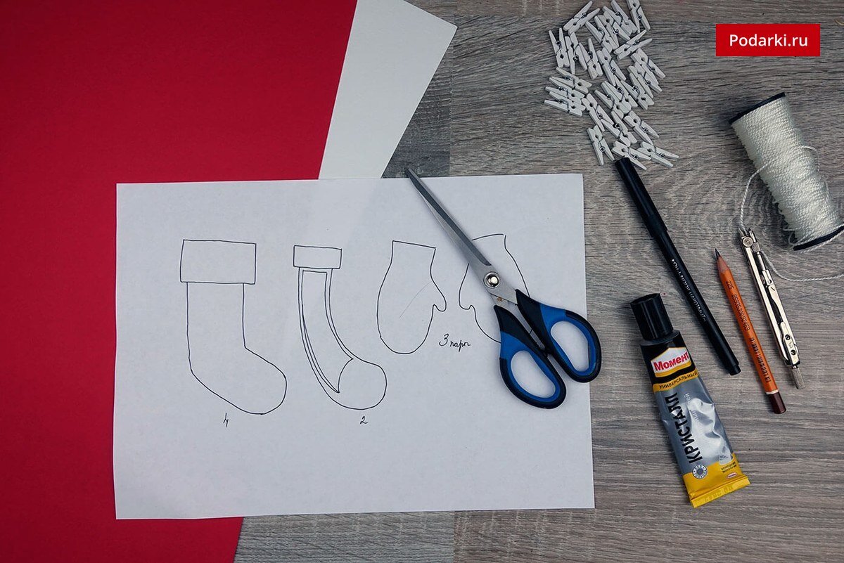 Дед Мороз будет рад, увидев свои валенки, носки и рукавицы развешенными у вас по квартире. Удовольствие от результата и процесса изготовления новогодней гирлянды гарантировано. Рекомендуем мастерить с детьми. Для гирлянды понадобится: Шаг 1. Распечатайте наш шаблон и перенесите его на красную бумагу. Прикрепленные файлы: На шаблоне указано сколько каких деталей необходимо обвести: 4 «валенка», 2 «носка» и 3 пары «рукавиц» Деда Мороза. Шаг 2. Вырежьте все детали красного цвета. Шаг 3. На бумаге для акварели белого цвета обведите 4 раза прямоугольник и 2 раза деталь носка (на шаблоне указано "белый"). Шаг 4. Вырежьте ножницами детали из белой бумаги. Шаг 5. Наклейте белые детали на красные согласно шаблону. Шаг 6. На рукавицах нарисуйте узоры черным фломастером. Шаг 7. С помощью циркуля начертите на белой бумаге по 20-30 кругов радиусом 1,5 и 2,2 см. Шаг 8. Вырежьте круги. Они будут изображать снежки на нашей новогодней гирлянде. Шаг 9. Приготовьте декоративные прищепки, «снежки», «варе