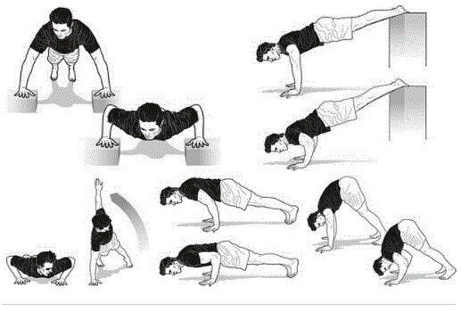 Убойный комплекс из отжиманий, забирай на стенку! 1)Коробки: качаем грудную клетку. Отжимание - дело полезное, но если усложнить задачу, ты сразу же почувствуешь прилив сил к торсу. Отожмись четырежды по 8-10 раз. Нет ничего проще? Тогда переходи к следующей стадии - положи перед собой на ширине плеч две невысокие коробки. Руки поставь на коробки, прими позицию, как для отжимания, руки полностью вертикальны. Опускайся всем телом между коробками, пока не почувствуешь растяжку грудной клетки. Закрепись на секундочку и можешь отжиматься обратно. 2)Т-отжимания. Следующее упражнение для верхней части пресса. Именно она отвечает за равновесие при отжиманиях на вытянутых руках. Отожмись в 4 подхода по 10 раз, уделив особое внимание тому, как ты это делаешь. Уже все получается? Едем дальше! Закрепись в позиции как для обычного отжимания и прижмись всем телом к полу, отожмись с силой и оторви одну из рук от пола. Закинь руку за плечо - у тебя из рук должна получиться прямая, а сам ты буд