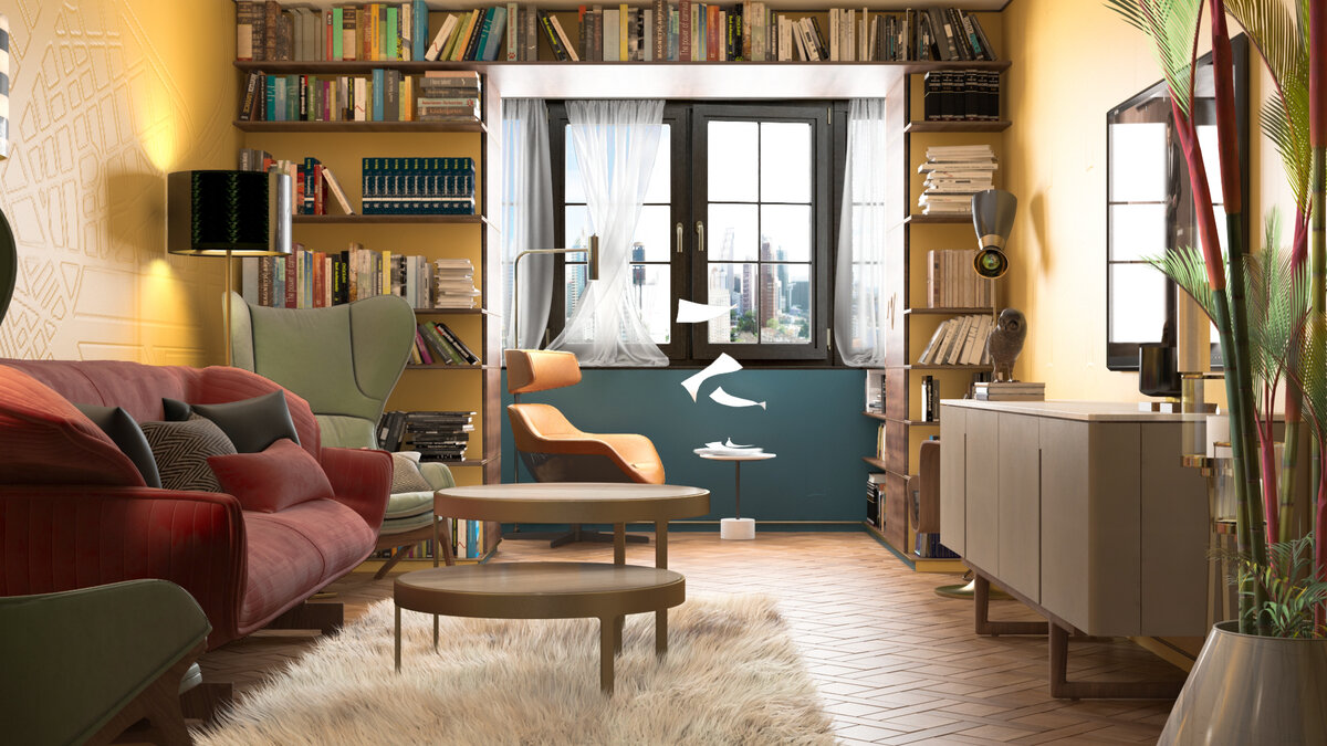 Квартира хороша тем, что комнаты достаточно большие – общая площадь 74 м² . Дизайнер Ани Енокян привнесла в неё яркости при помощи цвета и фактур. Главное, что сразу бросается в глаза – колористическое решение интерьера квартиры. Для стен гостиной выбрали горчичный оттенок, а одна из них приобрела фактурный геометрический рисунок. Усилили эффект журнальные столики и светильники с металлическими элементами, тонированными золотом. На контрасте с горчичным выделяется красный диван и пара дизайнерских кресел нежного мятного оттенка. Одинаковые по стилю но разные по расцветке торшеры с монохромными абажурами усиливают эффект симметрии. Балкон в гостиной присоединили и разместили там зону отдыха и кабинет с глубоким креслом и журнальным столиком. При этом всю стену вокруг окна обрамили множеством открытых полок для книг и предметов декора. Спальня решена в более приглушённом, но насыщенном и тёмном оттенке морской волны. Здесь тоже нашлось место фактуре, но на этот раз более строгой