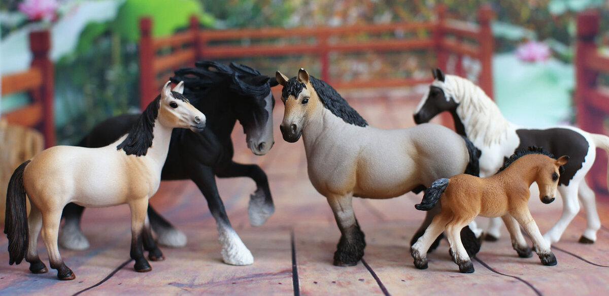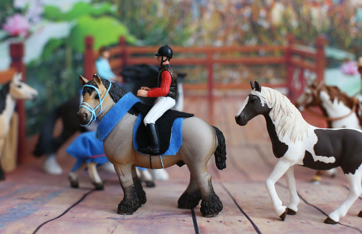 Обзор нескольких лошадей, фигурок Schleich, включая великолепного тяжеловоза, арденского жеребца (для него нашёлся и жеребёнок той же породы), а также самодельная амуниция: попоны, уздечки и недоуздки, вальтрапы, бинты и сёдла для лошадей. Дело в том, что для тяжеловозов у Шляйх трудно найти подходящее седло: обычные сёдла этим мощным лошадям маловаты, так что приходится придумывать что-то самостоятельно. Да и уздечек на все фигурки, когда их уже много, купить трудно: и тут на помощь приходят... цветные резиночки, из них получаются очень реалистичные уздечки буквально меньше чем за минуту, и какого угодно цвета! А для вальтрапов и сёдел пригодится фетр. Как всё это выглядит и одевается, где купить фигурки, смотрите на видео: https://www.toybytoy.com/figures/Ardennes-stallion-and-foal-Schleich-Mustang-and-other Чёрный шайр, ширский жеребец от Шлях, по материалу, что интересно, отличается от других лошадей: он немного более "резиновый", что не похоже на Schleich, более "жирн