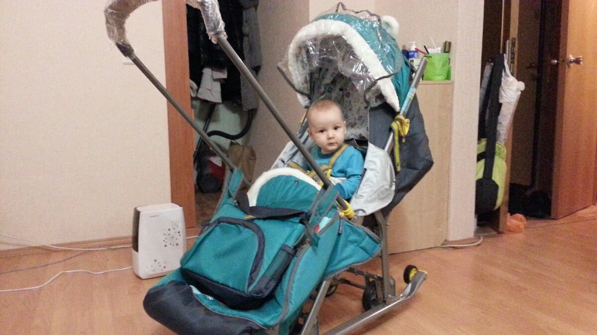 Ровно год назад, гуляя по улице с коляской, мы увидели девушку, которая везла своего ребенка на санках, а судя по имеющимся колесикам, при необходимости они превращались в коляску. Я и раньше видел такие, но поскольку мне это было не интересно, то не придавал им значения. А теперь, вроде, как есть сын и тоже хочется такие заполучить :) Решив устроить сюрприз, после работы прямиком я отправился в магазин детских товаров. Но, перед поездкой изучил все варианты и отзывы владельцев. Взвесив все За и Против, я остановил свой выбор на модели Ника 7-2. На тот момент, они были чуть дороже, но по качеству значительно превосходили остальных. Сама рама на которой установлены колесики, более прочная, а механизм опускания, более надежный и удобный. В комплекте имеется все, что нужно: матрасик, теплые рукавицы, дождевик, большая сумка, а ручка легко перекидывается. Приехав домой с огромной упаковкой, жена с Темкой стали любопытно ее разглядывать. Сын был передан в руки мне, а жена уселась на пол и