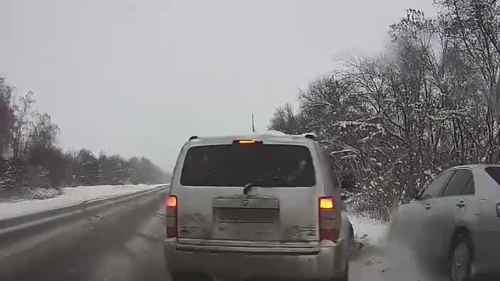В Сети появилась запись регистратора, снятая в Хлевенском районе Липецкой области. На видео попал момент в который три автомобиля чудом избежали жесткого столкновения. Сначала автомобиль «Рено». который двигался в попутном с регистратором направлении, выехал на встречную полосу, совершая обгон. В этот момент по «встречке» двигался внедорожник. Чтобы избежать столкновения водитель встречного авто крутанул руль вправо, в результате чего его занесло и потащило на встречную полосу. Владелец регистратора резко затормозил, «Тойота», которая двигалась следом, не успела также резко отреагировать на заснеженной дороге — машина вылетела на обочину. В тот же момент на обочине оказался и внедорожник. Машины разъехались буквально в миллиметрах друг от друга. Эту ситуацию иначе как чудом не назовешь. Автомобилисты, избежавшие ДТП, после опасного момента вышли из машин и пожали друг другу руки. most.tv/news/90427.html