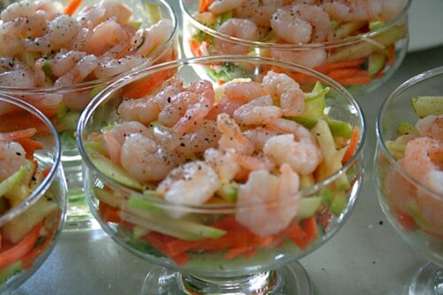 Для любителей креветок. Ингредиенты: Креветки свежие 200 грамм Огурец 70 грамм Яблоки 70 грамм Морковь 70 грамм Майонез по вкусу Лимон или апельсин 1 шт. Зелень по вкусу Приготовление: Креветки должны оттаять при комнатной температуре. Оттаявшие креветки промыть. Затем варить креветки в кипящей подсоленной воде 3-4 минуты. Варёные креветки очистить и нарезать (несколько креветок оставить целыми для украшения салата). Яблоки, морковь, огурец нашинковать тонкой соломкой. Чтобы яблоки не потемнели, их нужно сбрызнуть лимонным соком. В салатник выложить сначала огурцы затем морковь, на морковь яблоки и креветки. Сверху полить майонезом и украсить целыми креветками, зеленью по желанию и кусочком лимона. Приятного аппетита.