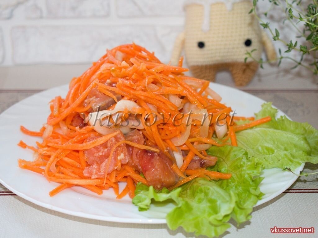 Рецепт приготовления пикантного салата Хе из малосоленой горбуши с морковью. Салат готовится из готовой горбуши пряного посола, для этого салата можно брать любую рыбу. Хе получается легким, немного острым и имеет очень аппетитный внешний вид и аромат.
