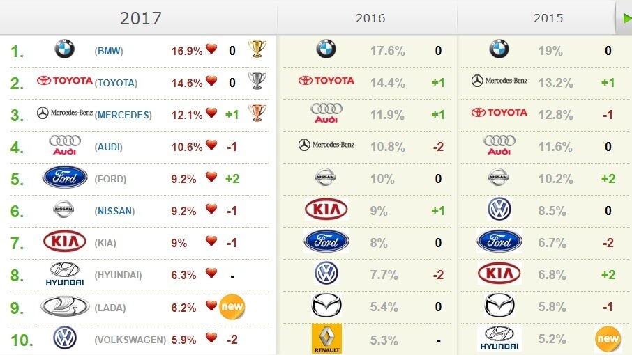 Продукция АВТОВАЗа впервые за девять лет исследования компании Online Market Intelligence вошла в топ-10 любимых автомобильных брендов россиян Автомобили марки Lada заняли девятое место в десятке самых любимых у россиян автомобильных брендов, следует из исследования. Таким образом, произведенные на АВТОВАЗе автомобили смогли опередить по популярности продукцию концерна Volkswagen. Немцы в этом году заняли 10 строку рейтинга, потеряв по сравнению с прошлым годом две позиции. Лидерство рейтинга самых любимых автомобильных брендов у россиян по традиции удерживают баварцы. Марка BMW занимает первую строку рейтинга с 2011 года. На втором месте, как и в прошлом году, японская марка Toyota. Замыкает тройку лидеров — Mercedes-Benz, подвинувший на четвертую строку Audi. В десятку самых любимых автомобильных брендов также вошли Ford, Nissan, Kia и Hyundai. Mazda и Renault, в прошлом году входившие в ТОП-10, рейтинг покинули. Источник