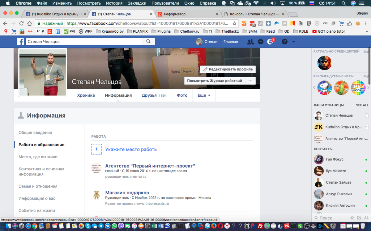 В ноябре 2017 года я анонсировал запуск проекта Кудалибо.ру, и захотел указать страницу как место работы. Но стандартные средства Фейсбука не позволили мне этого сделать. Пришлось решить проблему нестандартно, о чем и будет эта заметка. Как указать страницу Facebook местом работы Классический путь указания страницы FB как места работы, это зайти в свой профиль в раздел «Информация», далее в «Работа и образование»: Заходим в раздел «Информаци» и «Место работы» Здесь нам остается только нажать на «Укажите место работы», и начать заполнять поля. В простой ситуации вы просто начнете заполнять поле с организацией и она появится в списке без каких либо проблем: Выбираем свое место работы из списка Но что делать, если страница компании не появляется в списке вариантов фейсбука? Нестандартное добавление страницы Facebook местом работы Если страница не появляется в списке предложений фейсбука, даже если вы указываете все правильно, есть один хитрый метод. В первую очередь, вам надо зайти на стр