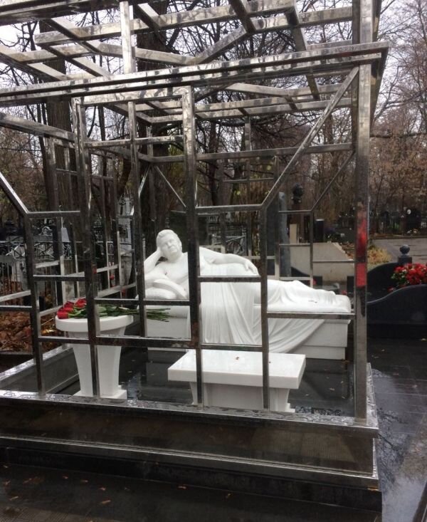 На Ваганьковском кладбище в Москве, рядом с могилами Эдуарда Володарского и Петра Фоменко появился необычный памятник. Никто не знает кто покоится на этом месте, никаких надписей на памятнике нет. Хотя сам памятник оставляет много вопросов: кто эта женщина, которая лежит на белой мраморной кровати и почему она заключена в такую громоздкую клетку из нержавеющей стали?