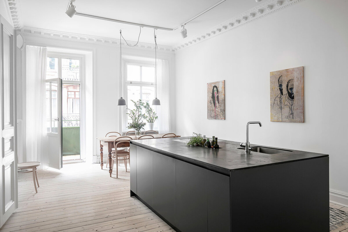 Апартаменты Chalmersgatan 16 от Alvhem сочетают в себе современный минимализм декора и традиционную базу исторического здания в Гетеборге, Швеция. Оригинальные молдинги придают сдержанному интерьеру особый шарм и мягкость. Центральным элементом в квартире является кухонный остров чёрного цвета, выделяющийся на фоне белых стен, потолка и дверей, а также пола из светлого дерева. Остальная кухонная мебель представлена тремя шкафами белого цвета, один из которых скрывает холодильник, и деревянными обеденным столом и стульями. Гостиная и спальни также не перегружены мебелью, выполнены в светлой гамме с отдельными цветовыми акцентами. Источник Смотрите далее: