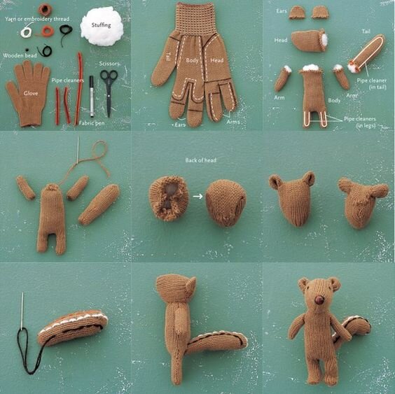 Наверняка у многих из вас завалялись старые перчатки, которые носить уже стыдно, а выкинуть жалко. А ещё бывает, когда вторая перчатка бесследно пропала, а с первой и не знаешь что делать. Оказывается всё довольно просто - одна единственная перчатка - превосходный материал для того. чтобы делать забавную маленькую игрушку-бельчонка. Понадобятся лишь разноцветные нитки, вата, синтепон или другой наполнитель, ножницы, фломастер и отличное настроение. Итак, приступим! 1. Для начала перчатку нужно разлиновать маркером так, как показано на рисунке ниже 2. Вырезать детали, сшить их и набить синтепоном 3. Сшить по кругу шею, 4. Загнуть деталь головы, чтобы получились ушки так, как показано на рисунке 5. Вышить цветными нитками хвостик 6. Вуаля! любить бельчонка и дать ему имя А ещё такую игрушку легко можно сделать с детьми. Так что это будет полезно и взрослым, и родителям. Всем хорошего настроения, Ваша Плюшевая Сова