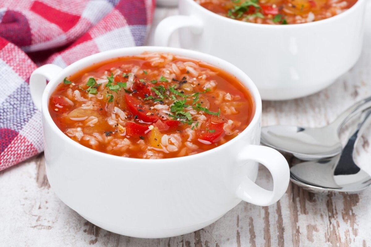 Идеальное первое блюдо для обеда. Ингредиенты: Картофель 200 грамм Морковь 50 грамм Лук репчатый 1 шт. Рис 20 грамм Вода 1 литр Сок томатный натуральный 0,5 литров Зелень по вкусу Чеснок 2 дольки Соль, перец по вкусу Приготовление: Нарезать кубиками картофель и морковь. Измельчить зелень и лук. Чеснок измельчить и растереть с солью. Довести воду до кипения, отправить туда нарезанную морковь, лук и варить 10 минут. Затем добавить томатный сок, картофель, рис и варить до готовности. Добавить в почти готовый суп чеснок, специи по вкусу и измельчённую зелень, довести до кипения и выключить. Приятного аппетита.