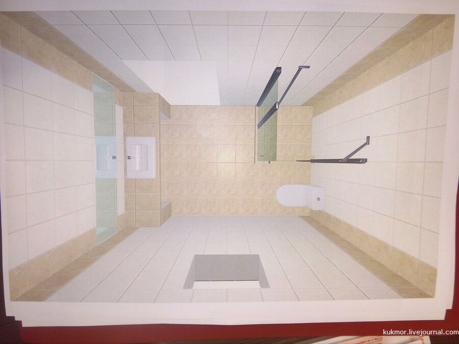 Что выбрали и почем читайте далее: Три Дэ модель санузла (дверь только на 50 см ближе к душу, на самом деле): 2. Выбрали для пола 1-го этажа вот эту плитку, особо много вариантов в нужном нам объеме и по устраивающей нас цене в ОБИ не было, н
