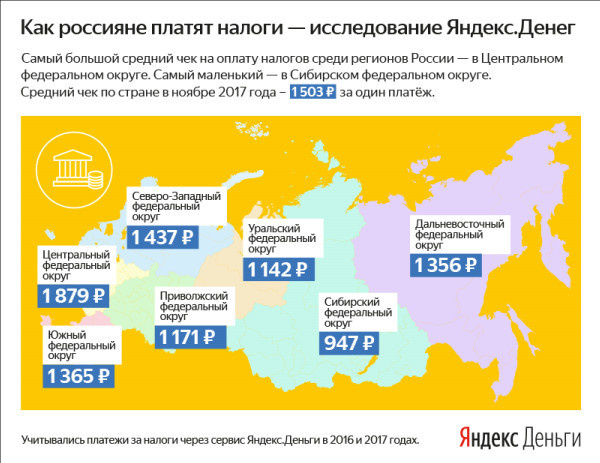 В исследовании рассматривались платежи на сайте «Яндекс.Денег» электронными деньгами и банковскими картами. Аналитики «Яндекс.Денег» выяснили, как россияне платят налоги через Интернет. В компании выяснили, что средний онлайн-платеж по налогам вырос на 31% и сейчас составляет 1503 руб. Крайний срок уплаты налога за предыдущий год наступает 1 декабря, поэтому пик платежей приходится на ноябрь и декабрь. В декабре по сравнению с июнем число налоговых платежей за имущество выше в 9 раз, а за транспортный и земельный налоги — в 8 раз. Меньше всего налоговых платежей было в феврале, июне и июле, рассказали специалисты. Половина платежей приходится на налог на имущество, 31% — на транспортный налог, 19% — на земельный. Среди регионов по величине среднего чека налоговых платежей лидирует Центральный федеральный округ, где платят по 1879 рублей. Завершает список Сибирский федеральный округ — там переводят по 947 рублей. В исследовании учитывались платежи на сайте «Яндекс.Денег» электронными