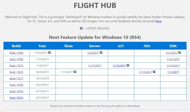 Один из менеджеров команды Windows Insider запустил прототип нового сервиса, предназначенного инсайдерам для слежения за номерами сборок в разных кругах обновления. Сервис получил незатейливое имя Flight Hub. В текущей версии Flight Hub — это статичная веб-страница с несколькими таблицами, содержащими информацию о номерах сборок и датах их публикации в разных кругах обновления со ссылками на анонсе. Для новейшей версии системы таблица включает в себя информацию о серверной редакции, IoT, ISO и SDK. Последний релиз отмечается в таблице символом ✈, символом * отмечаются сборки для Skip Ahead. Сейчас сайт обновляется в ручном режиме, но в будущем будет обновляться автоматически, обрастая новыми функциями, улучшениями для дизайна и удобства использования. Нам этот Flight Hub кажется полезным, но странно что он был реализован членом команды Windows Insider в частном порядке, а не стал частью приложения Центр отзывов, например.
