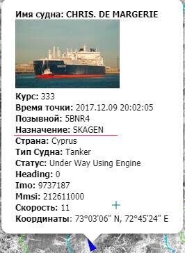 Первый газ «Ямал СПГ» пошёл по западному маршруту Танкер — газовоз «Кристоф де Маржери» (Christoph de Margerie), загруженный первой партией сжиженного природного газа проекта «Ямал- СПГ» в Сабетте, отправился по западному маршруту, свидетельствуют данные службы мониторинга судов MarineTraffic по состоянию на 9 ч мск 10 декабря. Точка следования танкера указана как Скаген, датский порт, где расположен крупный регазификационный терминал, скорость следования судна 7 узлов. Танкер — газовоз «Кристоф де Маржери» стал первым судном, загруженным 8 декабря СПГ, произведённым на российском проекте «Ямал -СПГ». Старт загрузки дал российский президент Путин.