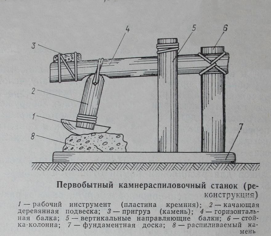 ...Со временем встал вопрос с распиловкой более крупных камней и лучковые пилы модернизировали сначала на водяной привод а после паровой и электрический. Первоначально от лучковых пил взяли рамку с металлической полосой - штрипсом.