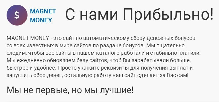 Проект представляет собой сайт по автоматическому сбору денежных бонусов со всех известных в мире сайтов по раздаче бонусов. На сайте http://bbot-ep.bonussitefree.com обещают стабильный доход, превышающий 22000 рублей в день. Заработок будет формироваться в автоматическом режиме, и представлять собой бонусы, полученные с нескольких тысяч компаний одновременно. Именно такую перспективу рисуют для нас создатели невиданного ранее детища под названием Magnet Money.