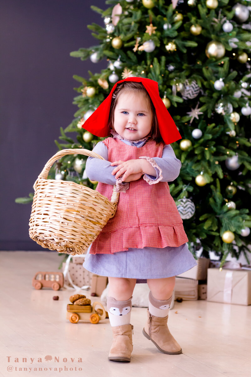 В детстве я каждый новый год наряжалась снежинкой. Каждый год мама пришивала к новому платью и чешкам мишуру, покупала корону и белые колготки. И каждый год я мечтала о более характерном персонаже, но за время детского сада так и не решилась сказать родителям об этом. В школе я уже сама заведовала новогодней костюмерной - от идеи до воплощения. Но почему-то эта детсадовская "снежная болезнь" меня до сих пор тревожит)))) Для себя решила, что с дочкой будем вместе обсуждать новогодний образ. В этом году Тасе два. Пока инициатором идей выступаю я. В начале октября мы ходили на балет "Спящая красавица". Из персонажей Тася запомнила принца, принцессу, злую тётю, птичку, котика и Красную шапочку. "О, Красная шапочка,"- подумала я... Тася идею одобрила. Больше всего ее привлекала красная шапочка. Всем Тася рассказывала, что мама ей купит красную шапочку, и она будет Красной шапочкой. Образ готов. Мы с Тасей довольны. Сшила передник и заветную красную шапочку. Платье перешитая п