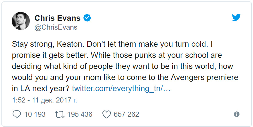 8 декабря Кимберли Джонс (Kimberly Jones) рассказала об издевательствах в школе над её сыном Китоном. На видео мальчик в слезах говорит, что одноклассники называют его «уродом», смеются над ним и его внешностью. Она отметила, что сын сам попросил опубликовать видео, когда боялся идти на школьный обед. «Мы все знаем, каково это — хотеть быть частью чего-то, но только некоторые знают, что такое не быть ни с кем», — Джонс. За три дня с момента публикации ролик посмотрели уже более 20 миллионов раз. Поддержку подростку выразили сотни пользователей, среди которых оказались знаменитые актёры, спортсмены и музыканты. Кроме того, Китона позвали на премьеру «Мстителей», футбольный матч и пообещали зайти в гости. Крис Эванс, актёр: «Будь сильным, Китон. Не дай им сломить тебя. Обещаю, вскоре будет лучше. Пускай эти школьные хулиганы гадают, какими людьми они хотят быть, как ты смотришь на то, что бы с мамой приехать на премьеру „Мстителей“ в Лос-Анджелес в следующем году?» Марк Хэммил, акт