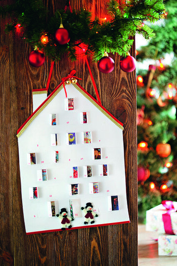 Все мы с нетерпением ждем Нового года. Готовим подарки, придумываем праздничное меню, украшаем квартиру. Больше всех новогодние празднику ждут, конечно же, дети. Чтобы ваш малыш знал сколько дней осталось до Нового года сделайте ему новогодний календарь. Чтобы его сделать вам потребуются следующие материалы и инструменты: 1. Картон или плотный ватман – 2 шт. 2. Линейка. 3. Карандаш или маркер. 4. Тесьма двух цветов. 5. Канцелярский нож. 6. Клей ПВА. 7. Новогодние картинки. Подготовив все необходимое, перейдем к реализации задуманного. Поскольку наш календарь будет иметь форму домика, в первую очередь нарисуем его схему. Сделать это с помощью миллиметровой бумаги. Перенесем получившийся рисунок на два листа ватмана и вырежем его. Кроме этого на одном из листов прорежем окошки, используя канцелярский нож. Теперь возьмем новогодние картинки и обрежем их по размеру, немного превышающему размер вырезанных окошек. Приклеим картинки к другому листу, расположив их так, чтобы они оказались под
