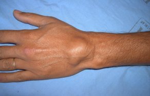 У меня на запястье на внутренней стороне образовалась шишка - не твердая, и когда нажимаешь на нее - болит. Что это может быть и как лечить? Прежде всего надо сказать, что под понятием «шишка» может скрываться масса разнообразных заболеваний. Но чаще всего описанная патология характерна для гигромы. Гигрома – это синовиальная киста, которая образуется в тканях нашего организма. Дело в том, что в результате ряда причин (травмы, воспалительного заболевания - как обменного, так и специфического характера, в частности ревматизма) внутри суставной сумки накапливается желеобразная жидкость. Боль возникает из-за того, что сдавливаются сосудисто-нервный пучок, сдавливается место присоединения сухожилия к суставу и т.д. Чаще всего гигрома возникает на кистевом суставе. Но может она возникнуть и в подколенных ямках, и в области голеностопных, локтевых и плечевых суставов. Чем же опасна гигрома? Первый неприятный фактор — это ее серозно-гнойное содержимое. Гигрома может вскрыться — при этом