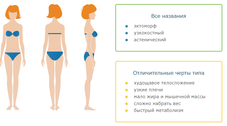 В свое время ученый из Америки Шелдон определил три основных типа тела. Эктоморфы – один из них, они отличаются высоким ростом, стройностью, слабо развитой мускулатурой и небольшой физической силой. Узкий плечевой пояс, длинные руки и ноги, тонкая область талии, худое телосложение и выпирающие кости – основные признаки эктоморфа. Особенности строения Эктоморфы имеют быстрый уровень обмена веществ, и если и увеличивают вес, то достигнув определенных лет, и если сильно переедают. В этом случае лишняя масса отложится исключительно в области талии. У девушек обычно выпирают ключицы, удлиненные пальцы, узкий объем талии, плеч, бедер, поэтому большая часть моделей является эктоморфами. У эктоморфов часто начинаются проблемы с набором мышечной массы. При тренировке образуется слишком мало миогенина, который отвечает за преобразование пищи в мышцы. Физические нагрузки Эктоморфы мало развиты в физическом плане, также у них слабые суставы, это не дает им выполнять упражнения с большой нагруз