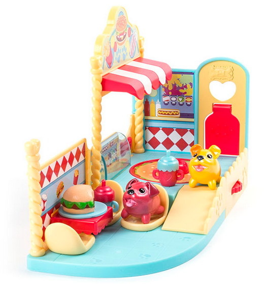 Кафе выполнено в нежно голубом, красном, лимонном и белом цветах, украшено следами лапок и изображениями всевозможных вкусностей. В кафе очень уютно: здесь есть витрина с напитками, столик, три стульчика и вращающаяся платформа в виде гигантского бургера. Две фигурки упитанных питомцев уже в комплекте! Фургон и две фигурки пухлых собачек — и мы отправляемся в путешествие! Игрушечное транспортное средство способно трансформироваться в палаточный лагерь. Дом на колёсах оснащён звуковой системой и подвижным тостером, который располагается на кухне. В комплект также входит сумка для игрушечного щенка. Фигурки обладают колёсами, они могут переворачиваться и передвигаться в разные стороны, очень смешные! Игрушечных животных также можно пок