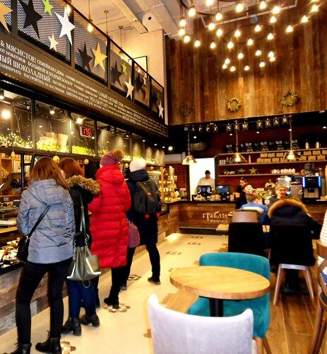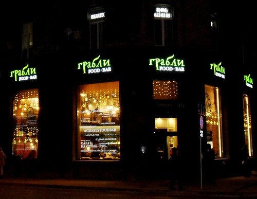 Недавно мы с подругами обнаружили отличное место для встреч и разговоров. Им оказалась новая кафешка с буржуйским названием Грабли Food-bar. Новое заведение расположено весьма выигрышно - всего сотня шагов от м. Китай-город, самый центр и вместе с тем, это моя любимая Солянка - т.е. улочка довольно тихая, очень московская, да еще и дом - старый доходный. Т.е. стены толстые, потолки высокие и в окна приятно наблюдать за движением на улице. Внутри - современное пространство в стиле лофт, т.е. кирпичные стены, удобные столы, стулья и диванчики, много света и вообще приятно. Всего два этажа. На первом - раздача еды и пара столиков для тех, кто торопится; на втором - более камерное и уютное помещение, располагающее к долгим философским беседам: А в укромном уголке прячется жутко популярный столик с качелями Все, что вы выберете, можно съесть здесь, а можно забрать домой - недостатка в пластиковых контейнерах и фирменных пакетах нет. Кстати, это удобно. Когда мне лень готовить ужин