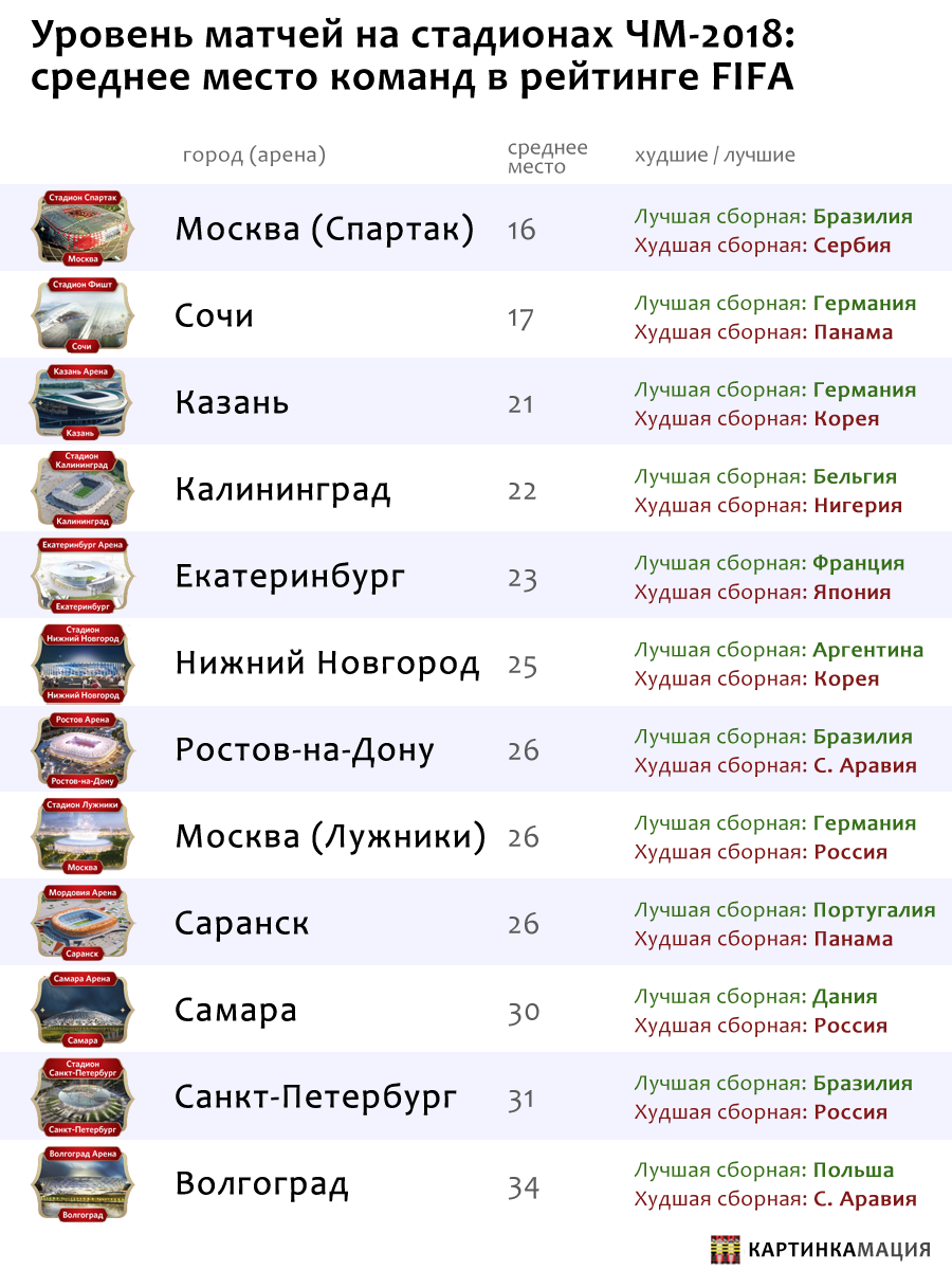 В Кремле прошла жеребьёвка группового этапа Чемпионата мира по футболу 2018 года. Участники турнира были распределены по 11 городам России: каждый из них сыграет в трёх разных стадионах. Во все города приедет как минимум одна команда с мировым именем. По среднему уровню сборных больше всего повезло Москве, а именно стадиону "Спартака", и Сочи. Там сыграют команды с лучшим среднем местом в действующем рейтинге FIFA. В Санкт-Петербурге и Волгограде средний уровень команд будет самым слабым. Но зато в Санкт-Петербург приедут Бразилия и Аргентина, а в Волгоград — Польша и Англия. Россия на данный момент имеет самый низкий рейтинг FIFA. Она сыграет в "Лужниках" (с Саудовской Аравией), Санкт-Петербурге (с Египтом) и Самаре (с Уругваем). Картинкамаия в Вконтакте и Telegram