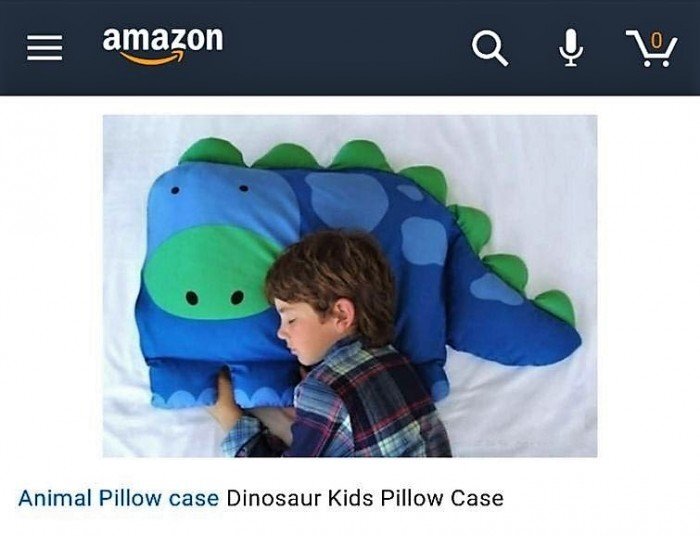 На самом деле он получил наволочку с распечатанным на ней изображением ребёнка, спящего на подушке в виде динозавра.