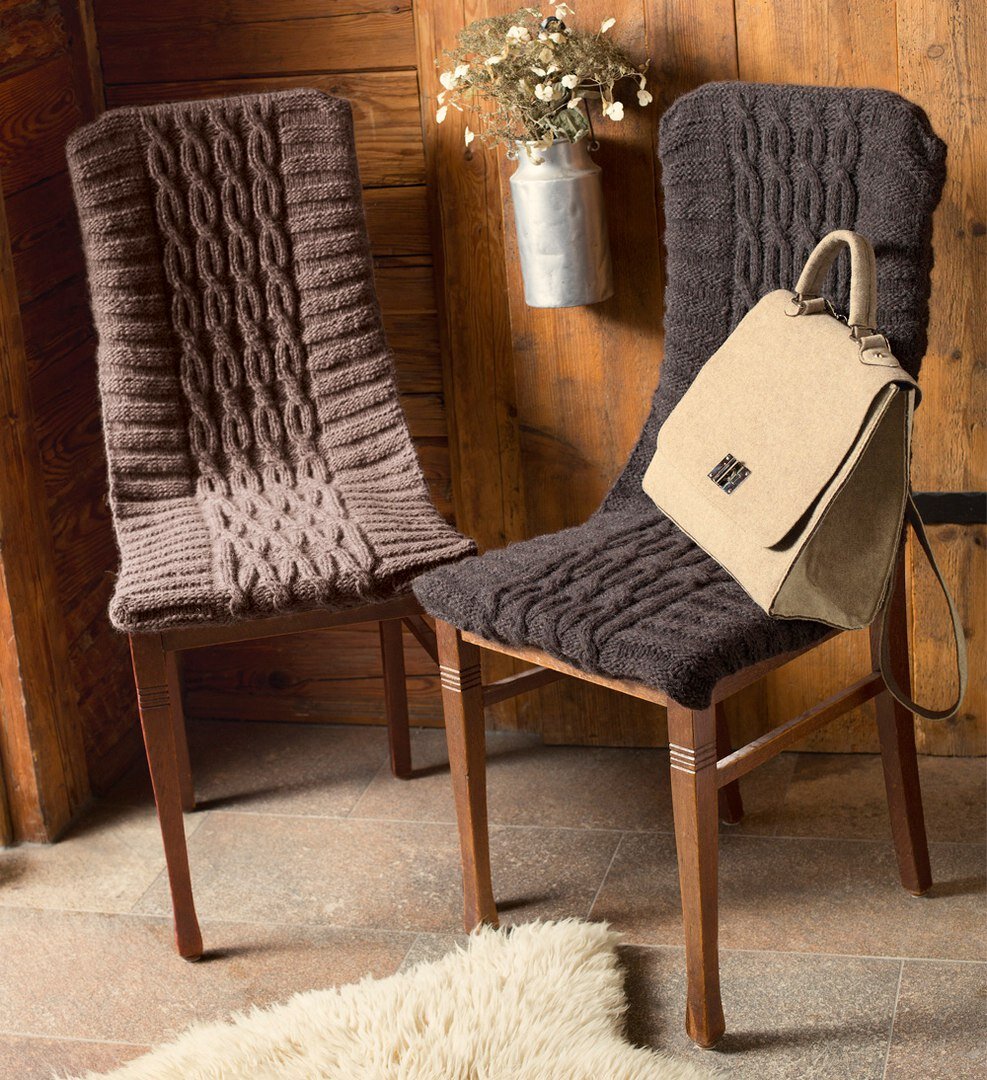 Пряжа (30% натуральной шерсти, 28% шерсти беби альпака, 22% полиамида, 20% шерсти яка; 110 м/50 г) — 200 г цв. дерева или темно-коричневой; спицы №6; 2 стула (ширина сиденья ок. 42 см, длина 40 см; высота спинки ок. 42 см).