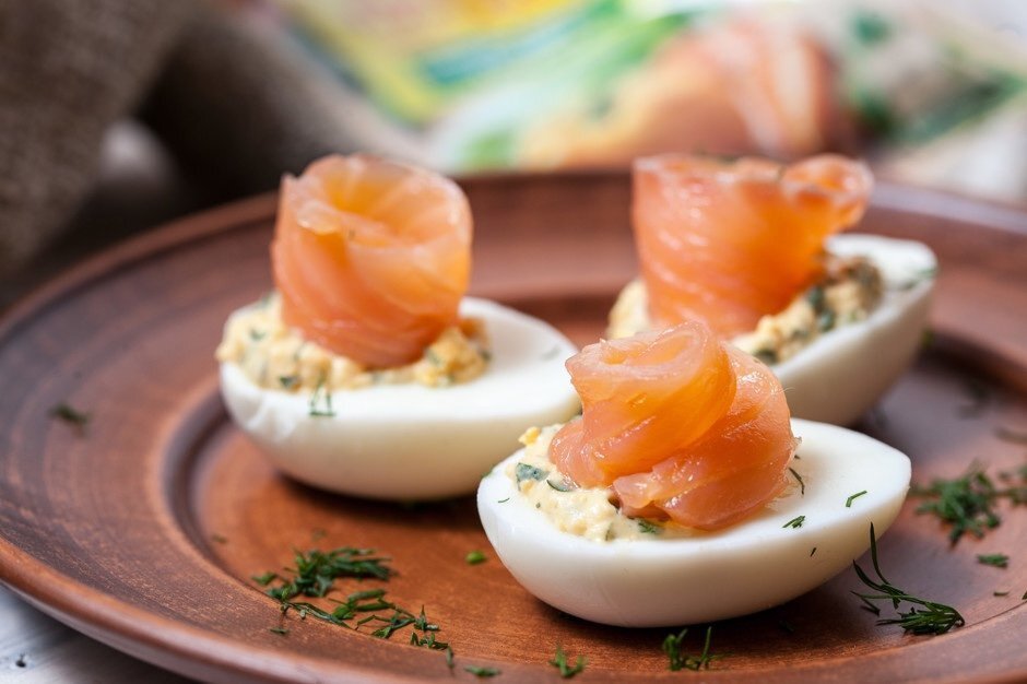 Приготовление займёт всего 15 минут. Ингредиенты: Яйца куриные 8 шт. Лосось копчёный 25 грамм Укроп и кинза по вкусу Перец чёрный молотый по вкусу Для домашнего майонеза: Желток 1 Горчица дижонская 2 чайных ложки Лимонный сок 20 миллилитров Масло оливковое 100 миллилитров Масло подсолнечное 100 миллилитров Соль по вкусу Приготовление: Варить яйца 7-8 минут, затем остудить, очистить и разрезать пополам. Достать желтки и размять их в грубое пюре. Мелко нарезать лосось. Для майонеза взбить миксером желток, горчицу и сок лимона до появления пены. Смешать масло обоих видов и тонкой струйкой вливать в яичную смесь, помешивая. Посолить. Добавить 60 грамм майонеза в пюре из желтка (оставшейся майонез убрать в холодильник, он вам пригодится для других блюд), вмешать лосося и мелко нарубленную зелень. Поперчить и перемешать до однородного состояния. Выложить начинку на половинки яиц, можно украсить укропом или ломтиками лосося. Приятного аппетита.