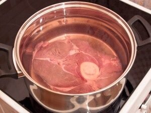 - Мясо помыть, поставить на огонь цельным куском, довести до кипения, снять пену шумовкой, варить далее на умеренном огне до полной готовности примерно час.